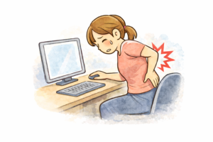 特に多いのが、デスクワークや家事・育児などで同じ姿勢が続き、腰以外の筋肉(骨盤周り・腿・背中・肩など)が代わりに負担しているケースです。その結果、腰に直接痛みがなくても、負担の連鎖で痛みが長引くことがあります。