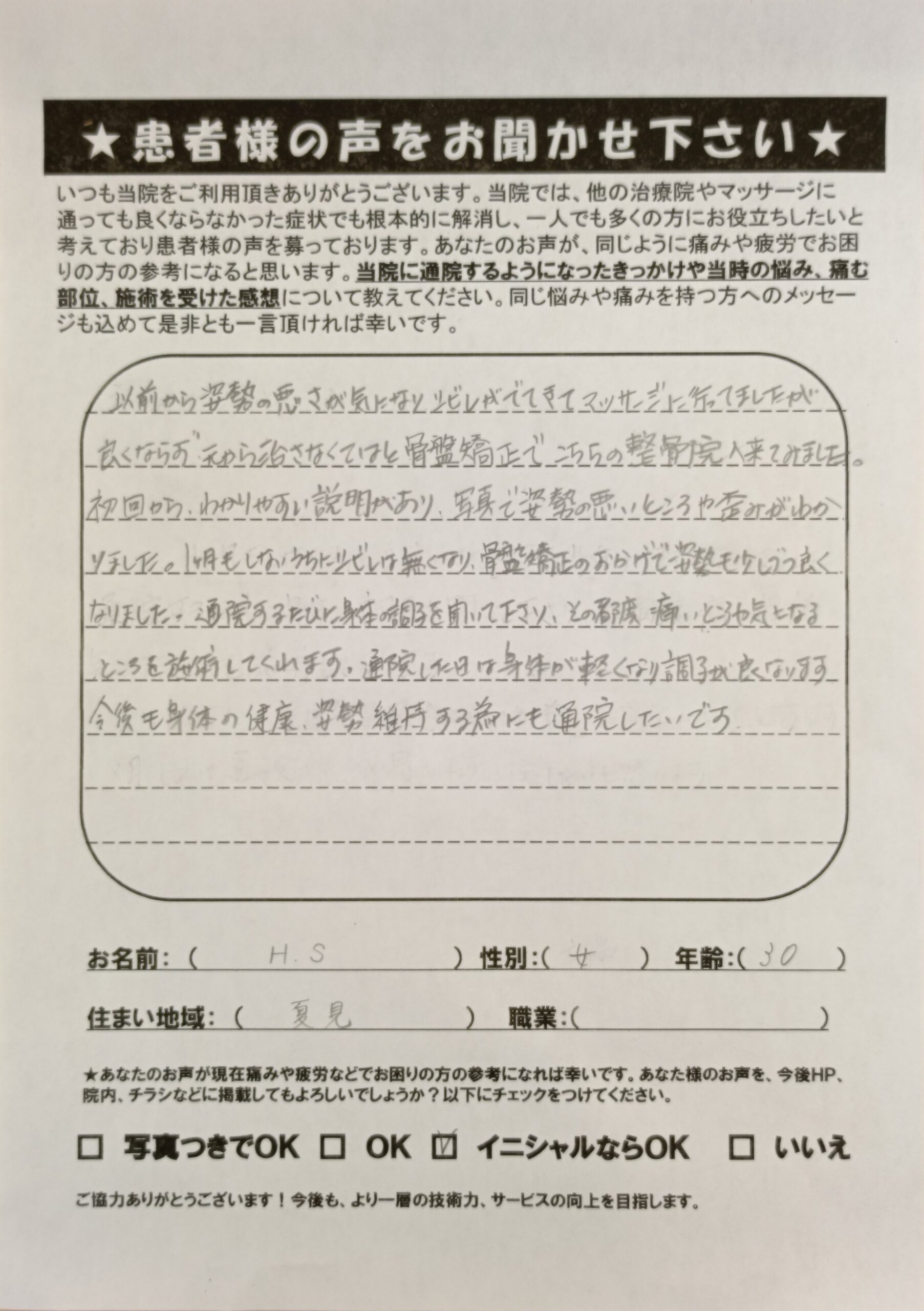 • 船橋市 夏見 H.Sさん 女性 骨盤矯正